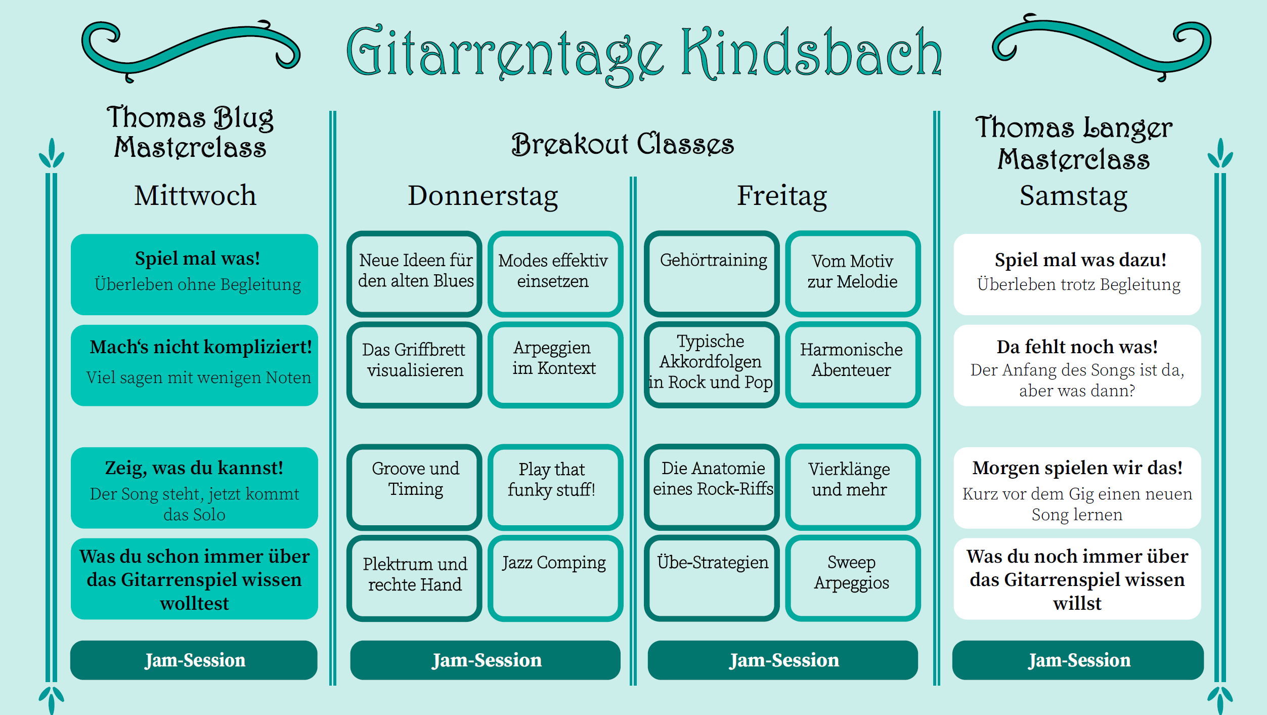Die Veranstaltung richtet sich an elektrische Gitarristen mit Spielerfahrung. Wir sind auf keine Stilistik festgelegt, bewegen uns aber wahrscheinlich im Umfeld der Genres Rock, Blues und Jazz.